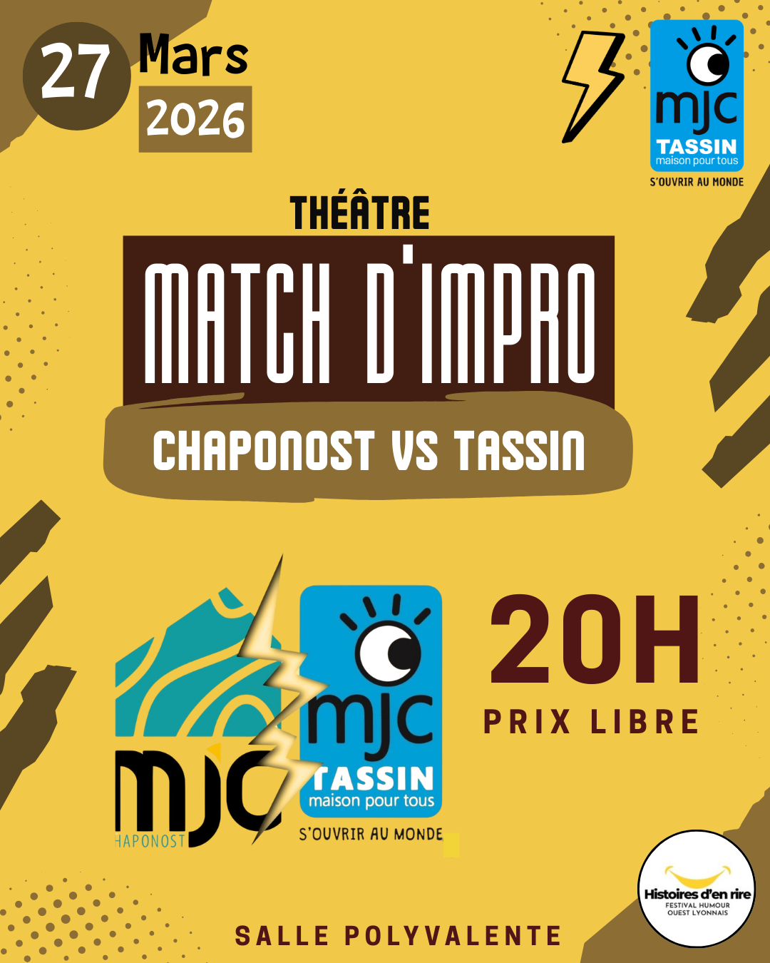 Dans le cadre de la 15ème édition du festival Histoires d’en rire, un match d’impro a lieu dans notre MJC ! Notre troupe de théâtre d’impro accueille la troupe d’impro de la MJC de Chaponost pour une soirée pleine de rires !