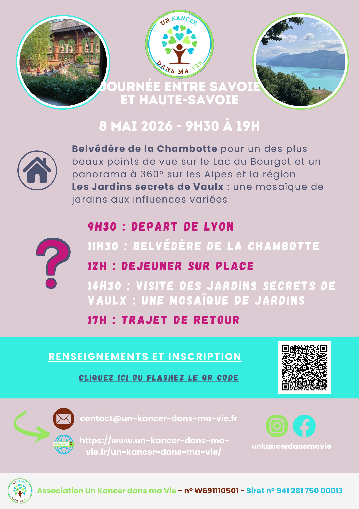 L'association Un Kancer dans ma Vie organise une journée entre Savoie et Haute-Savoie à la découverte du Lac du Bourget et des jardins secrets de Vaulx pour un groupe de 8 personnes.